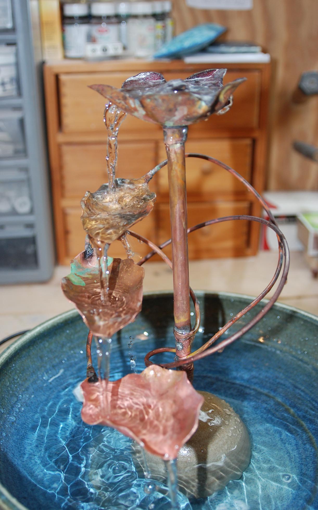 It is comprised of a copper ‘flower’ that has been enameled (glass fused to metal at 1500F, soldered to a copper stem with three copper ‘leaves’ on smaller diameter stems. Water falls from the flower into the top leaf and on down into the other two and into the bowl. I will use this model, noting what to keep and what to change to make the next, in which I hope to resolve all the issues, which are primarily aesthetic as it does work well.