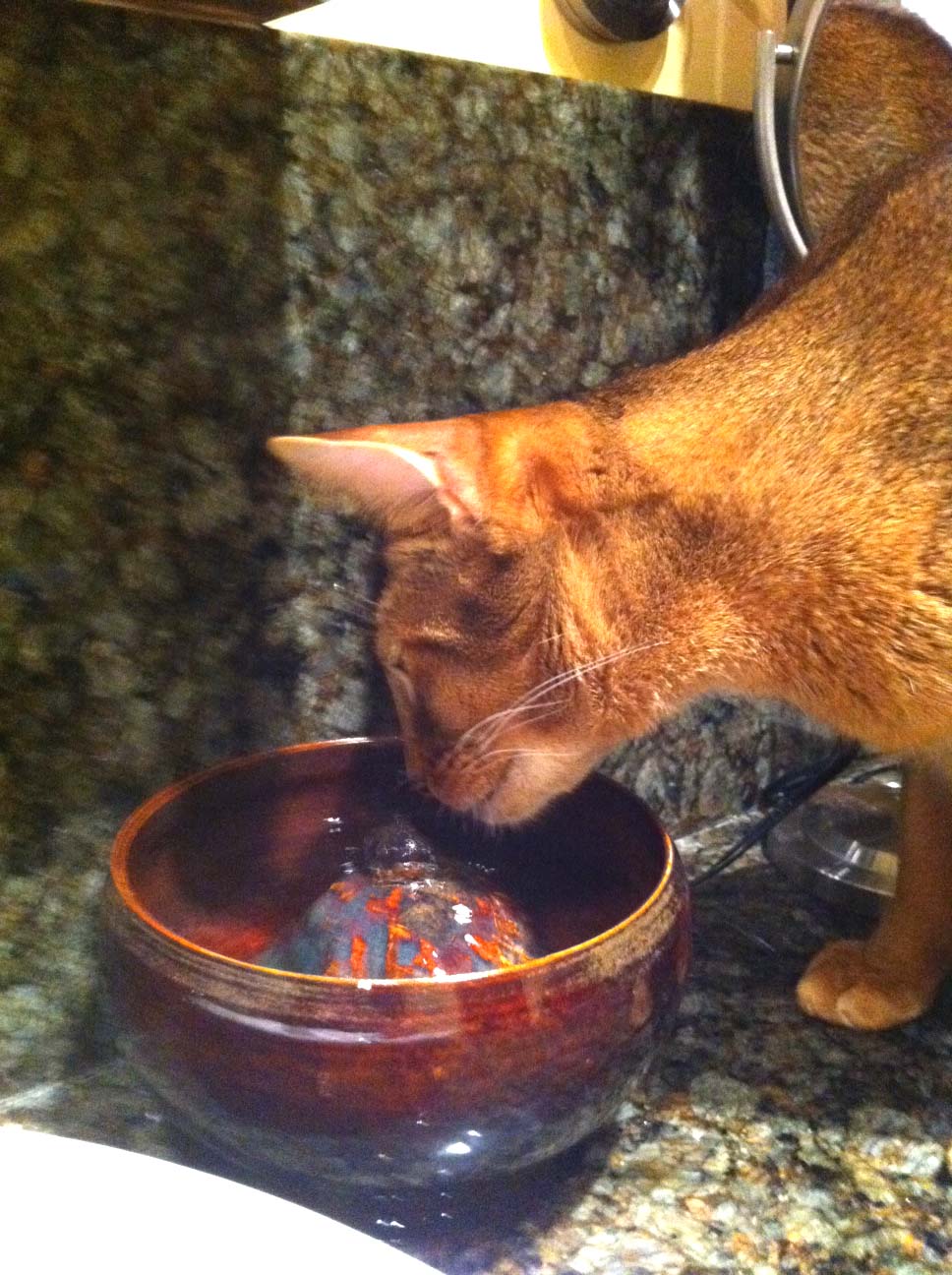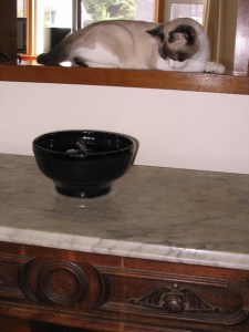 Any fountain, even the best of the ceramic cat fountains such as ours which are handmade of 100% food save stoneware and tested and proven glazes still need an occasional cleaning. Though the copper used in many of our fountains inhibits a lot of bacteria growth, water is the natural home of billions of organisms and if allowed to sit will eventually become distasteful to your cat. Generally, cleaning about once a week seems good, at least for Bijou who is a very clean, short-haired cat but with other breeds and more cats more frequent cleaning is probably in order – possibly about once every four days.